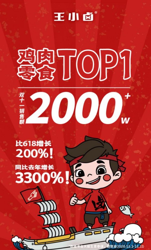 2020年双11电商大促,王小卤开局便拿下天猫鸡肉零食类目Top 1,最终销售额超2000万人民币。同比今年618增长200%,同比2019年双11增长3300%。