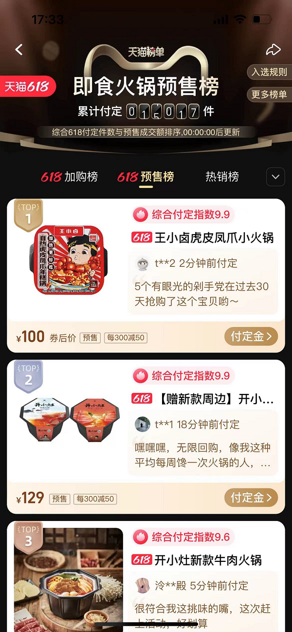 自5月26日预售开始以来,截止5月31日,王小卤自热虎皮凤爪年糕锅的订单突破4500单,位居天猫618即食火锅预售榜第一;除此之外,王小卤虎皮凤爪也在天猫618零售预售榜中冲进TOP3。