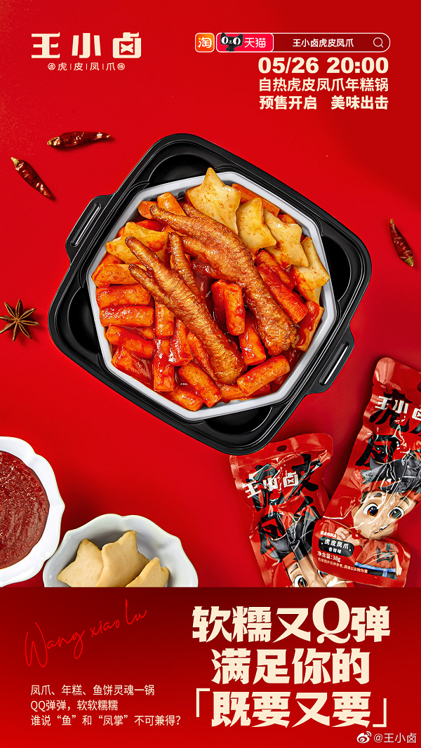 618大促战役刚刚打响,王小卤就推出重磅新品——自热虎皮凤爪年糕锅。这款将虎皮凤爪和年糕、鱼饼相结合的创意新品一经推出就引发关注,成为消费者热议的自热锅爆款。作为虎皮凤爪的领军品牌,王小卤曾以一己之力带火虎皮凤爪这个品类,并成功打造超级大单品,创下自2020年6月至今持续占据天猫鸡肉零食类目销量TOP1和连续三年全国虎皮凤爪销售额第一的亮眼成绩。