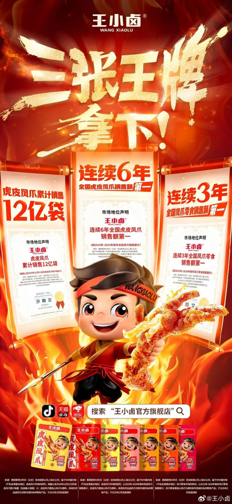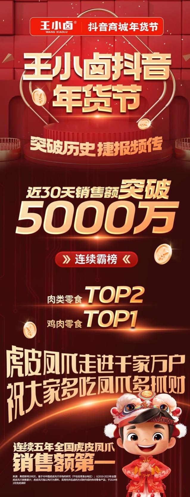 近日,王小卤官方公布最新消息,根据国际权威机构弗若斯特沙利文对虎皮凤爪及整个凤爪零食赛道进行的市场全局调研,王小卤虎皮凤爪已累计销售12亿袋,并取得“连续6年全国虎皮凤爪销售额第一”、“连续3年全国凤爪零食销售额第一”的市场地位。
