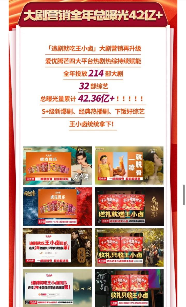 通过场景重构,王小卤将虎皮凤爪绑定追剧伴侣、上班下午茶等新消费场景,凭实力撕开了增量市场。据统计,王小卤在2024年通过“专剧+经典剧”的组合策略,全年投放了214部大剧与32部综艺,刷屏爱优腾芒四大平台,狂揽曝光42亿+,广泛覆盖到各类剧目类型的不同受众人群,互联网讨论声量也随之直线上升。