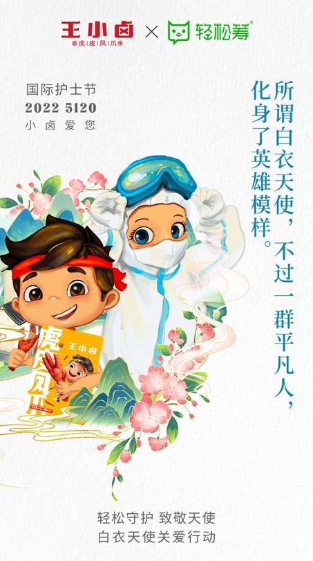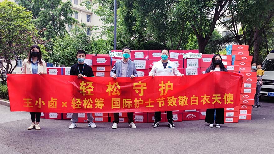 5月12日国际护士节,国民卤味王小卤携手轻松筹开展白衣天使关爱行动,向护士群体捐赠爱心产品。“轻松守护,致敬天使”由轻松筹公益、中国华侨公益基金会、北京微爱公益基金会共同发起,并联合“爱心公益大使”赵雅芝、李若彤、李晨、金晨等向社会发起共同呼吁,关注和关爱护士群体。